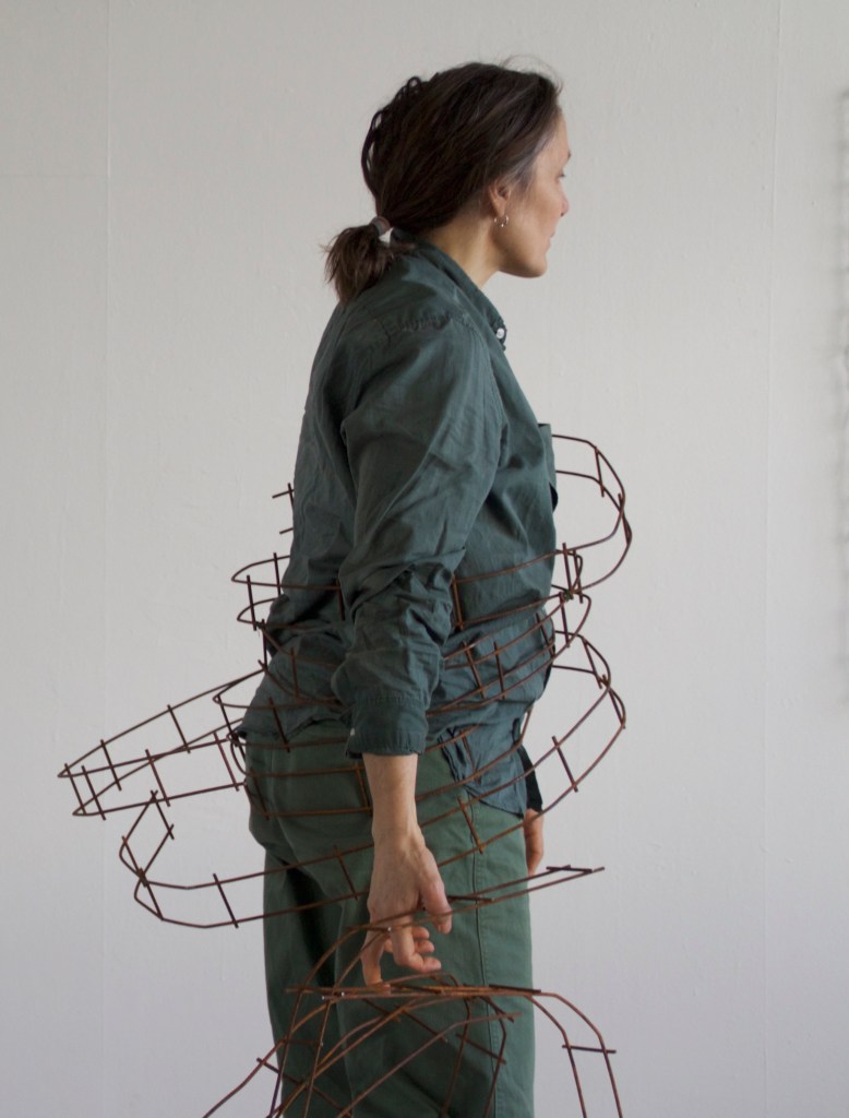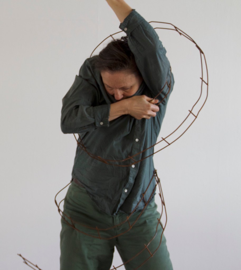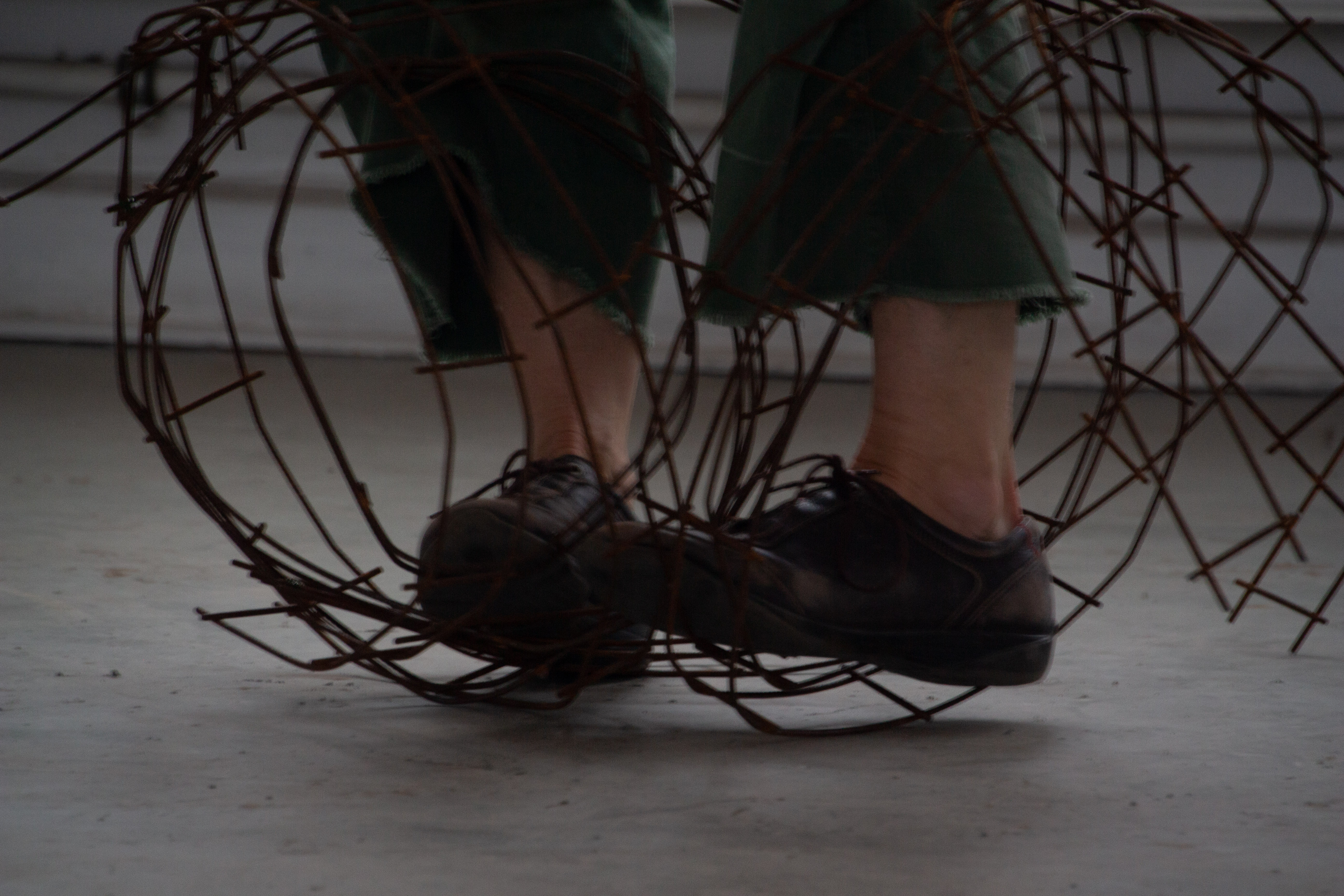 “Sarah carried several items up and down the stairs, these items were in direct opposition to her organic body. They were mainly rusted steel, spiraled around her arms, legs and torso, but also around a large branch. These items influenced the movements of her body. Wearing them as cloth AND burden, she went through a multitude of feelings as she tried to deal with them as something non-negotiable. Sarah had a strong presence in the exhibition, perhaps more than she expected. Perhaps because in Leipzig the collective consciousness has a strong memory of the un negotiable, too.” Maeshelle West-Davies, April 2020